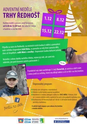 Od 1.12. v Ředhošti začínají adventní neděle a pokračují 8.12., 15.12. a 22.12.2019 od 8.00 do 12.00 hodin. Budou zde k vidění i naše zvířátka. Můžete jim donést zbytky suchého chleba. Pochutnají si.
