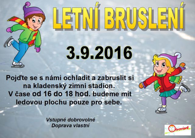 Zdravíme, rádi bychom Vás pozvali na letní bruslení na ledě! V nadcházejícím teplém počasí to bude jistě příjemné osvěžení. :-) Přijeďte v sobotu na Kladno na zimní stadion (hlavní plochu) - v čase od 16 do 18 hod. pro nás je zarezervovaná hlavní ledová plocha. Těšíme se. Váš Otvovísek