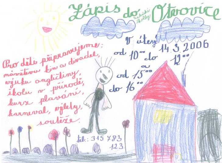 Zápis do mateřské školky v Otvovicích proběhne v úterý 14.3.2006 od 10.00 do 12.00 hodin a od 15.00 do 16.00 hodin. Telefon: 315 783 123